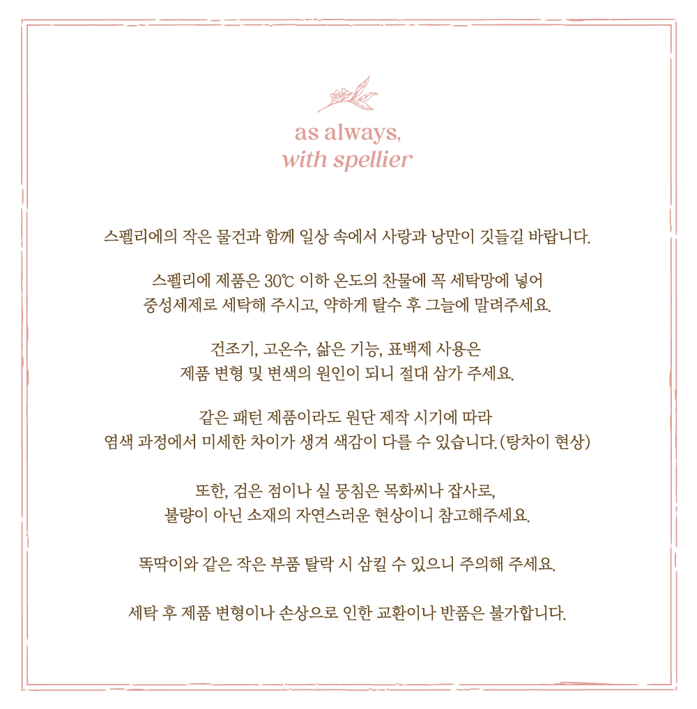 * 스펠리에 제품은 30℃ 이하 온도의 찬물에 중성세제로 세탁해 주세요.